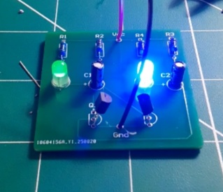 This is a PCB of a standard circuit: Astable Multivibrator. LEDs alternate, meaning that one is on and the other is off. This happens continuously, creating a blinking pattern.